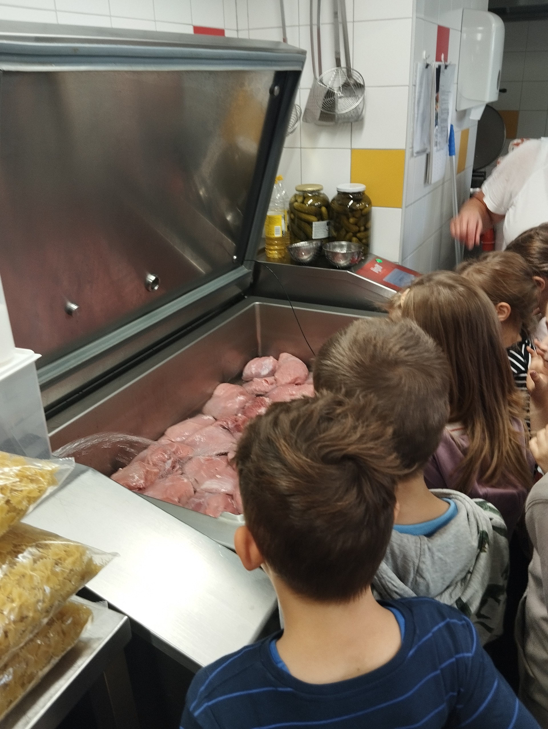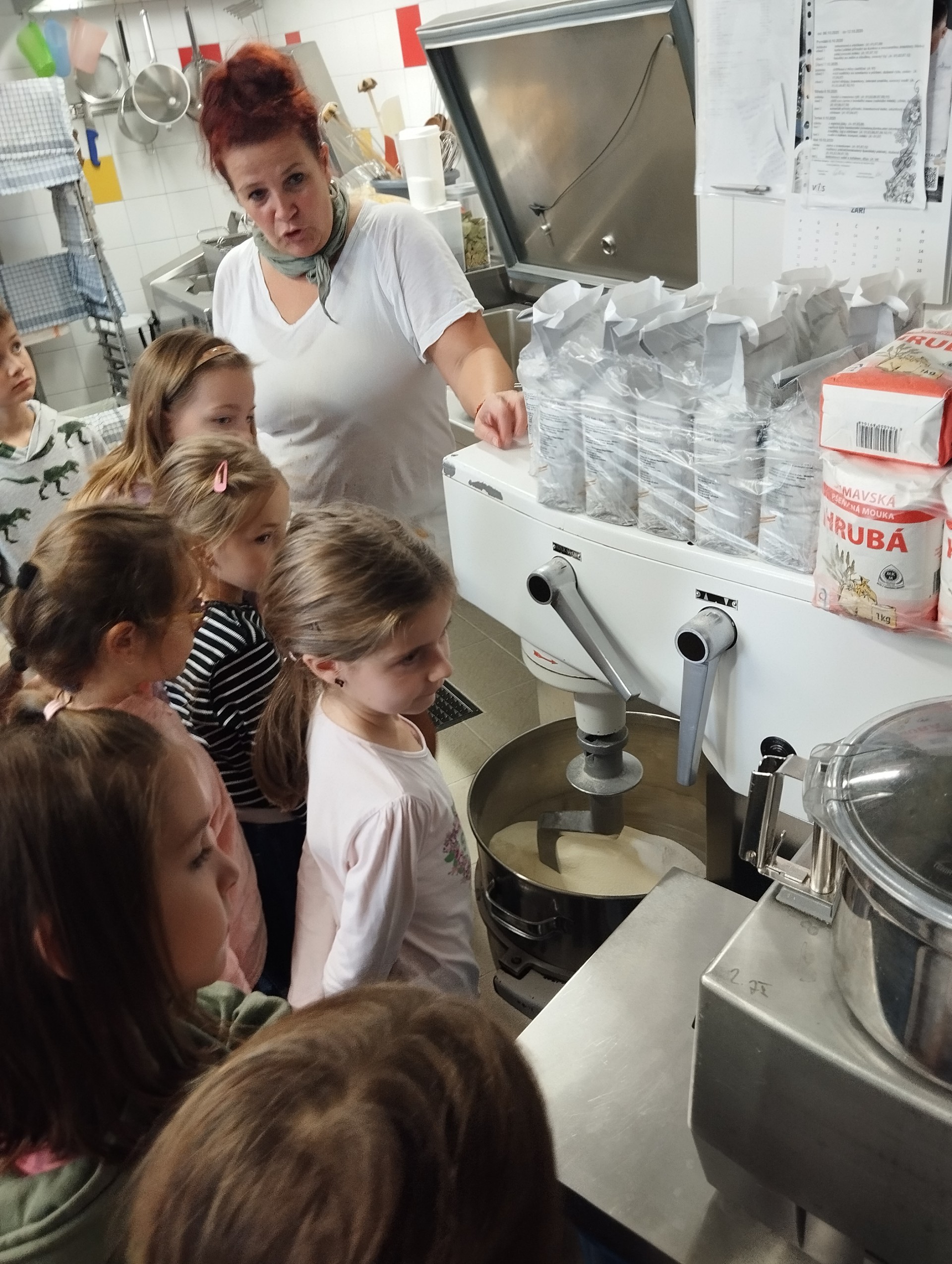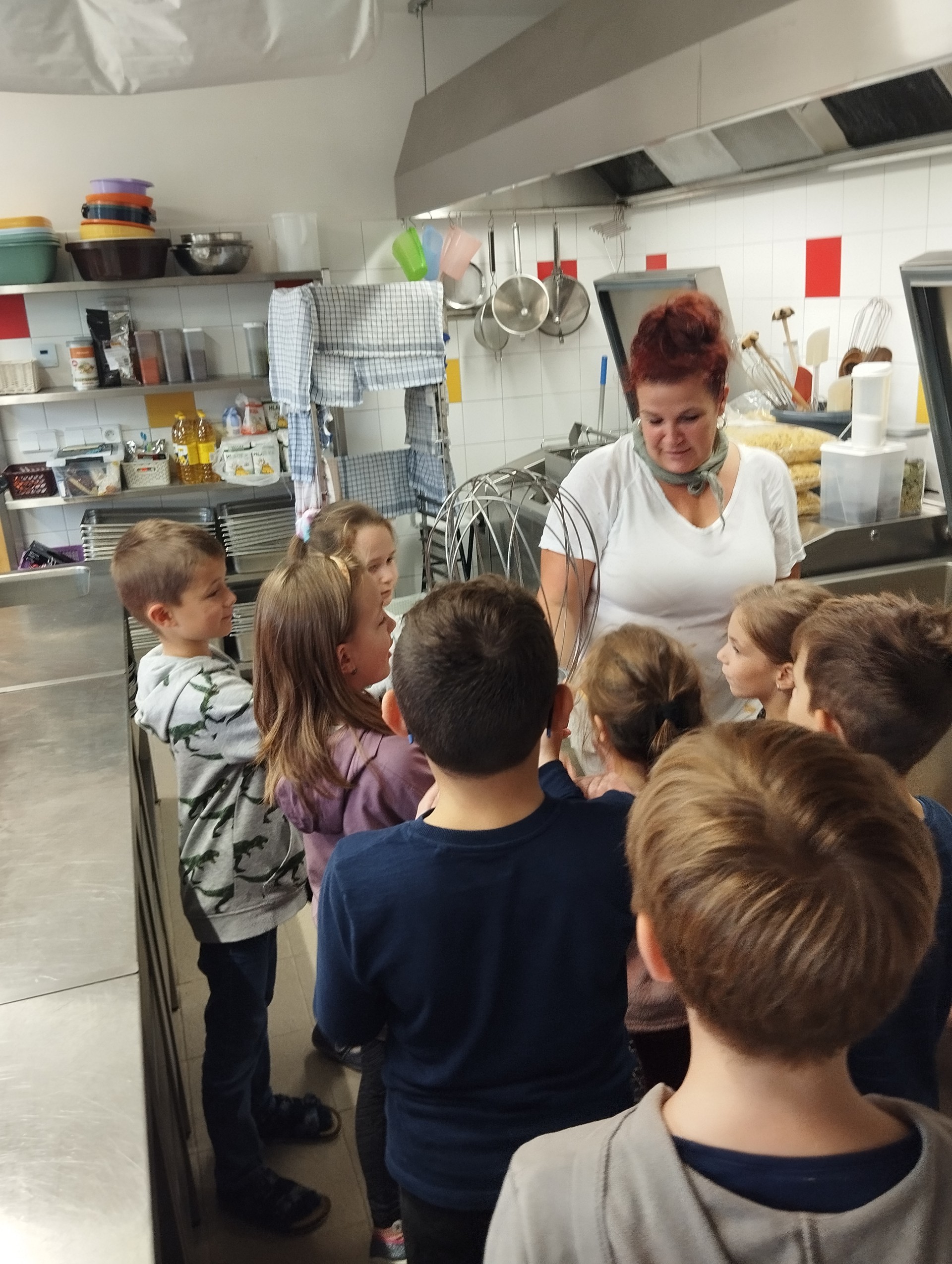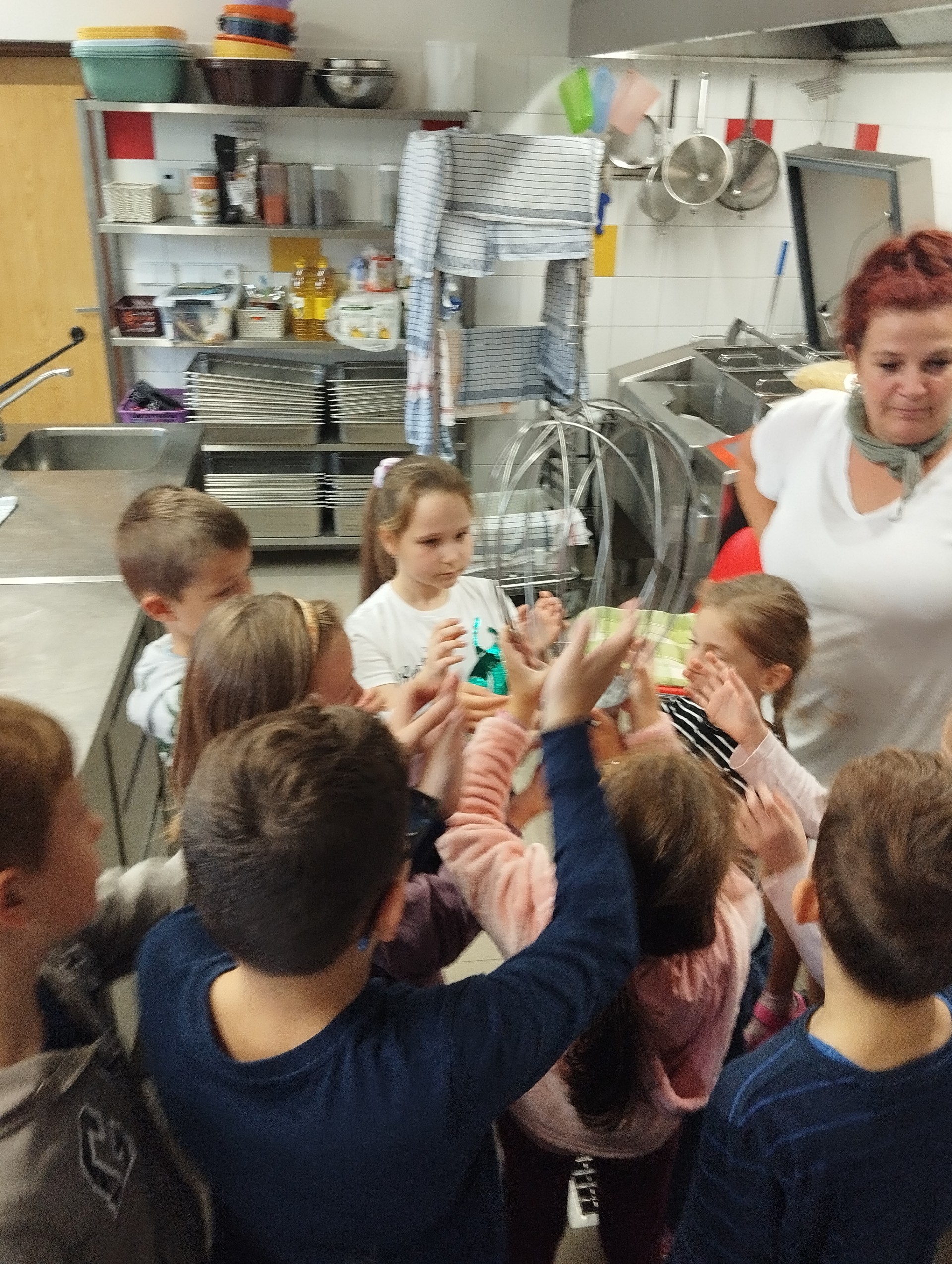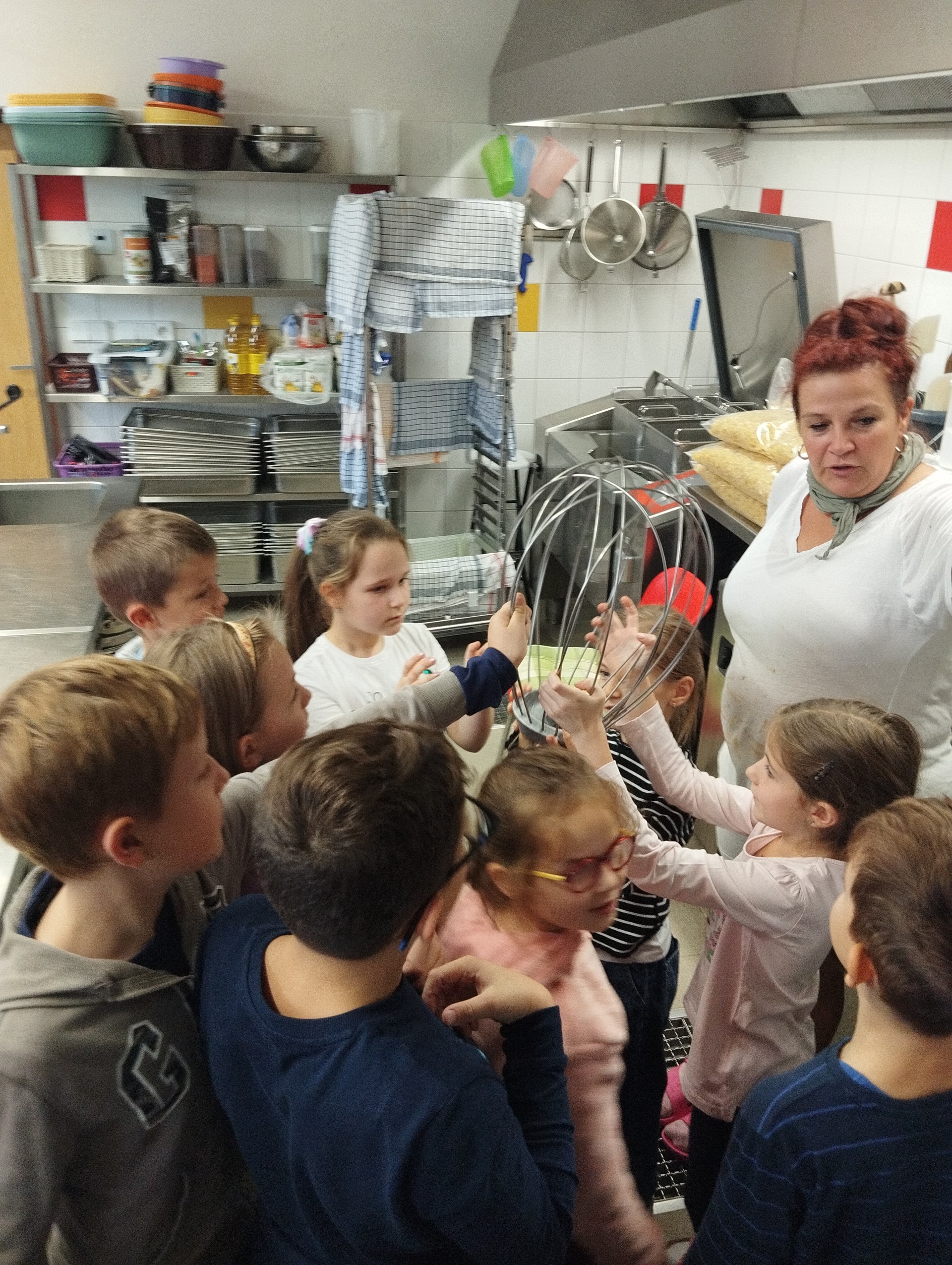 Minulý týden proběhla ukázková hodina školní jídelny a kuchyně za doprovodu paní kuchařky Natálky Kymlové. Děti z druhých tříd navštívily vnitřní  prostory kuchyně, kde mohly vidět nejen vybavení, ale i třeba velká balení jídla (např. těstoviny) nad kterými žasly, či přípravu základu pro Hamburskou smetanovou omáčku, z čehož měly veliký zážitek!