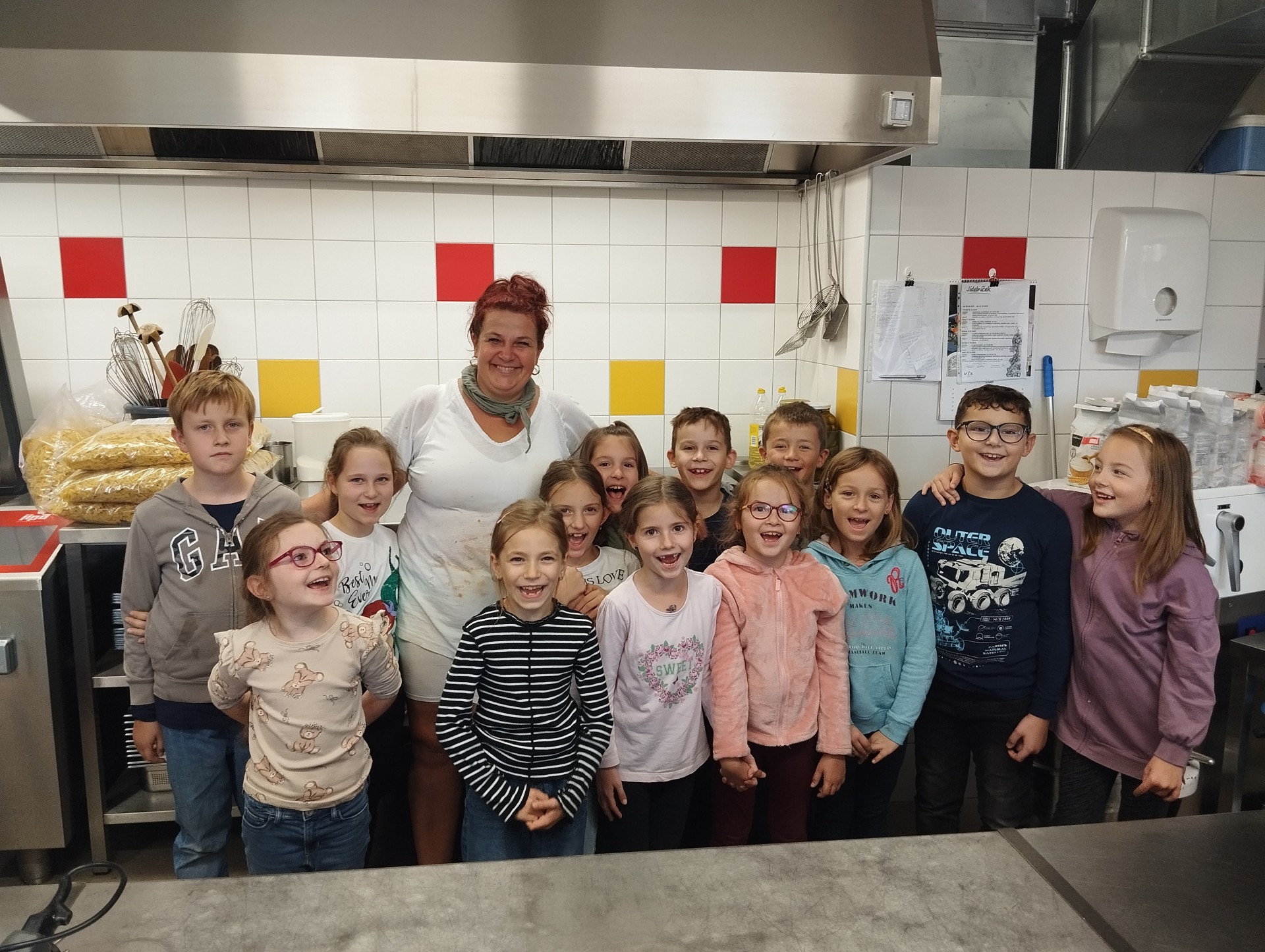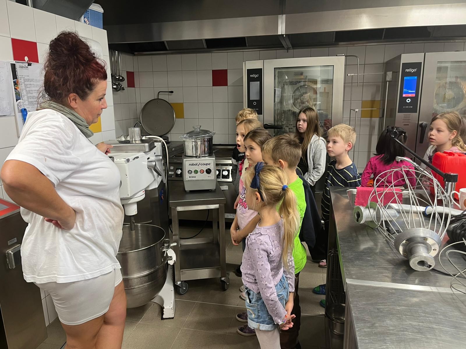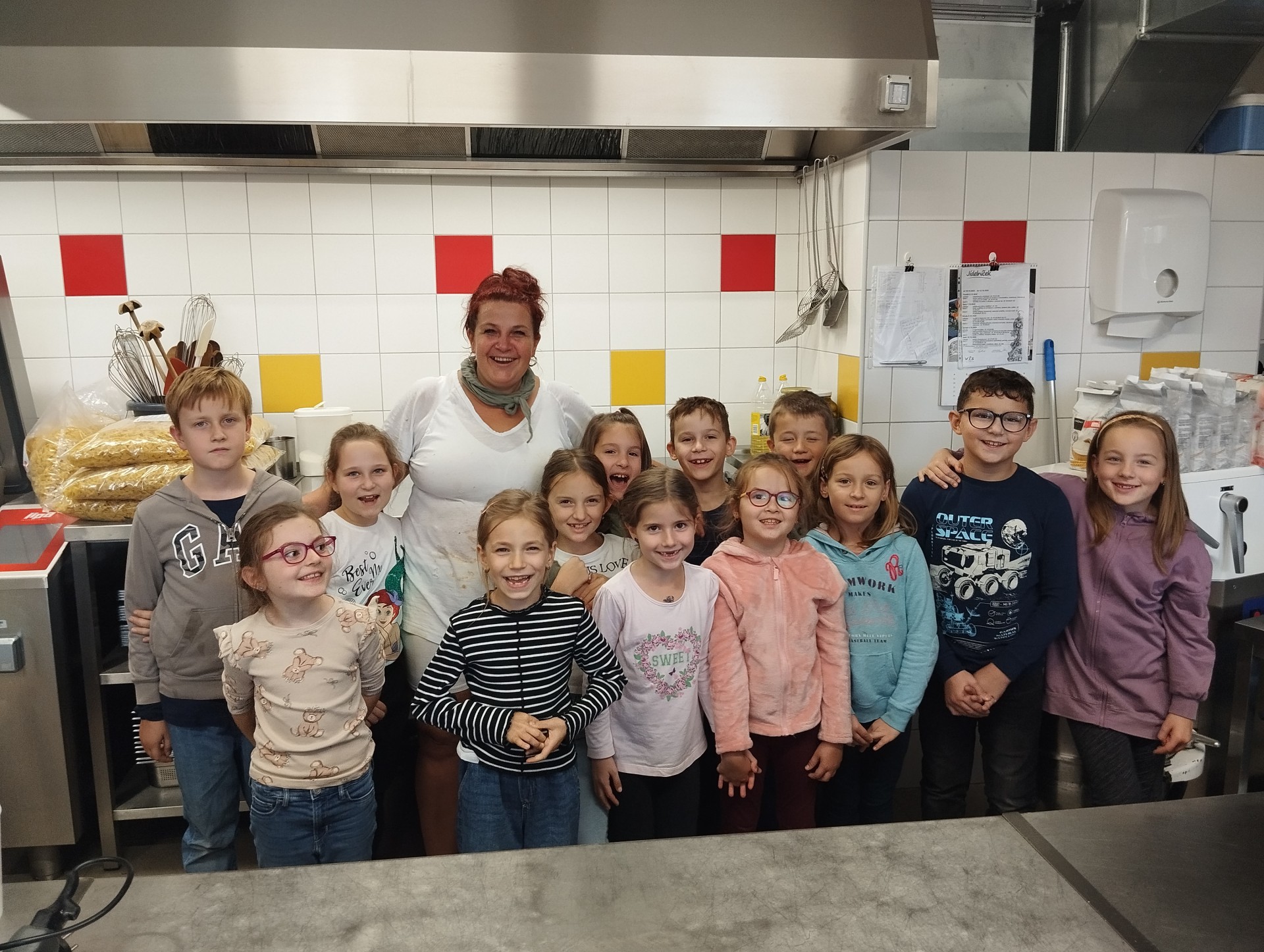 Minulý týden proběhla ukázková hodina školní jídelny a kuchyně za doprovodu paní kuchařky Natálky Kymlové. Děti z druhých tříd navštívily vnitřní prostory kuchyně, kde mohly vidět nejen vybavení, ale i třeba velká balení jídla (např. těstoviny) nad kterými žasly, či přípravu základu pro Hamburskou smetanovou omáčku, z čehož měly veliký zážitek!