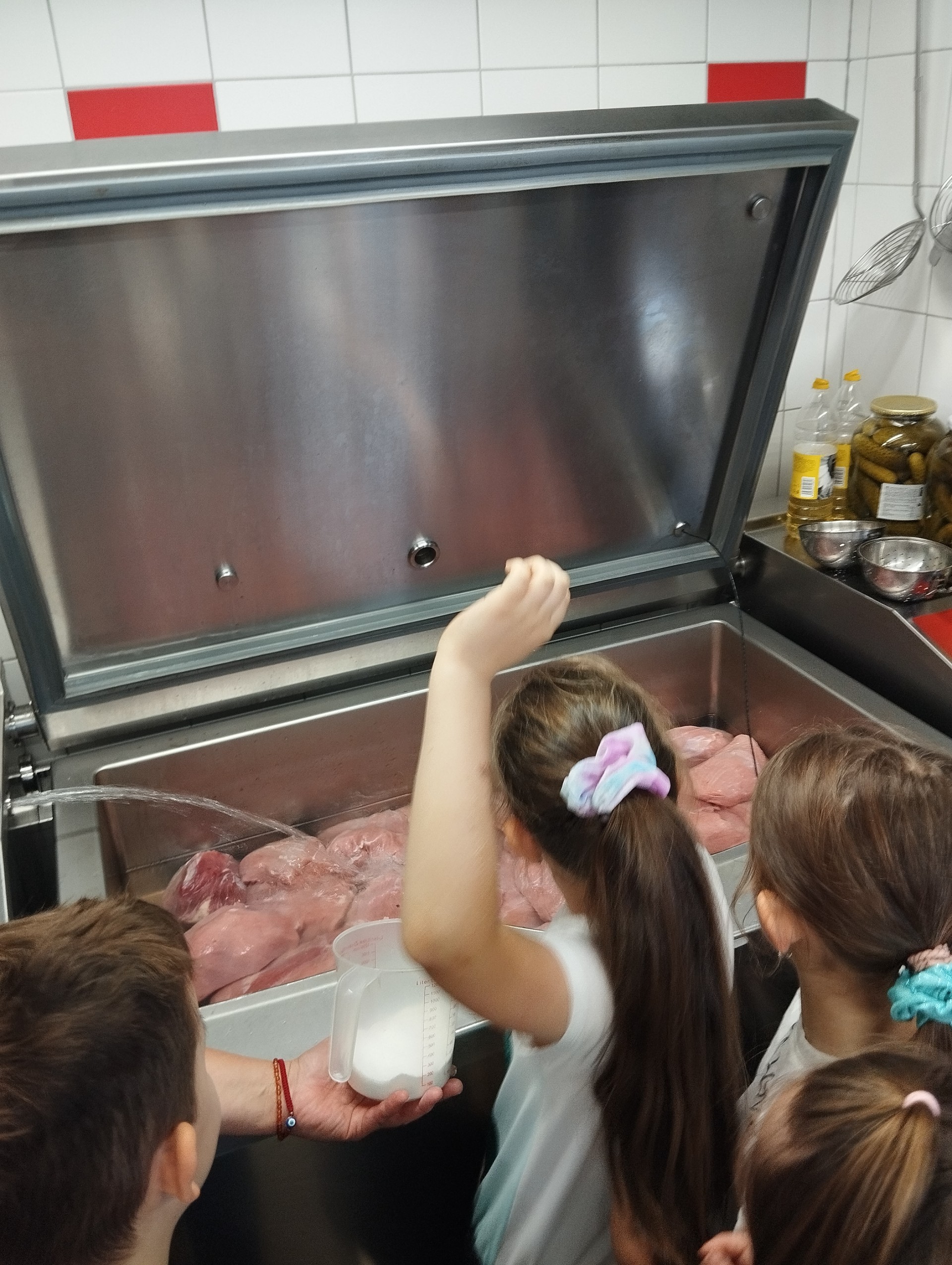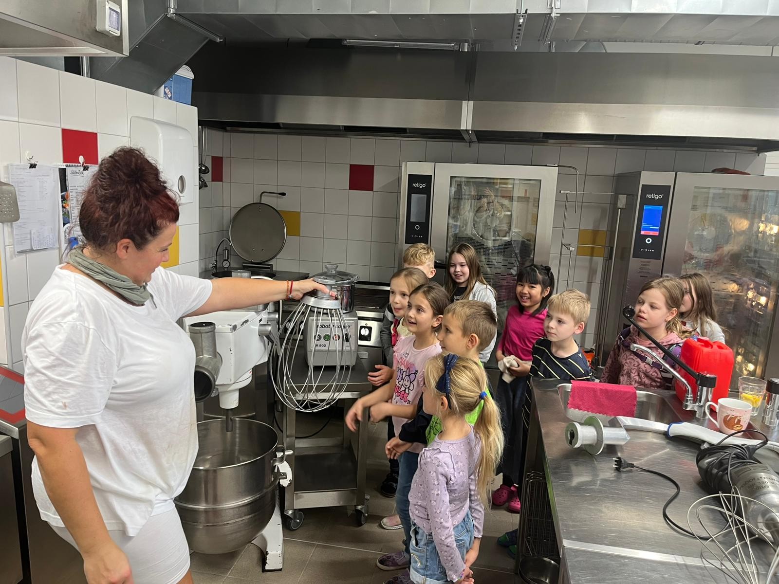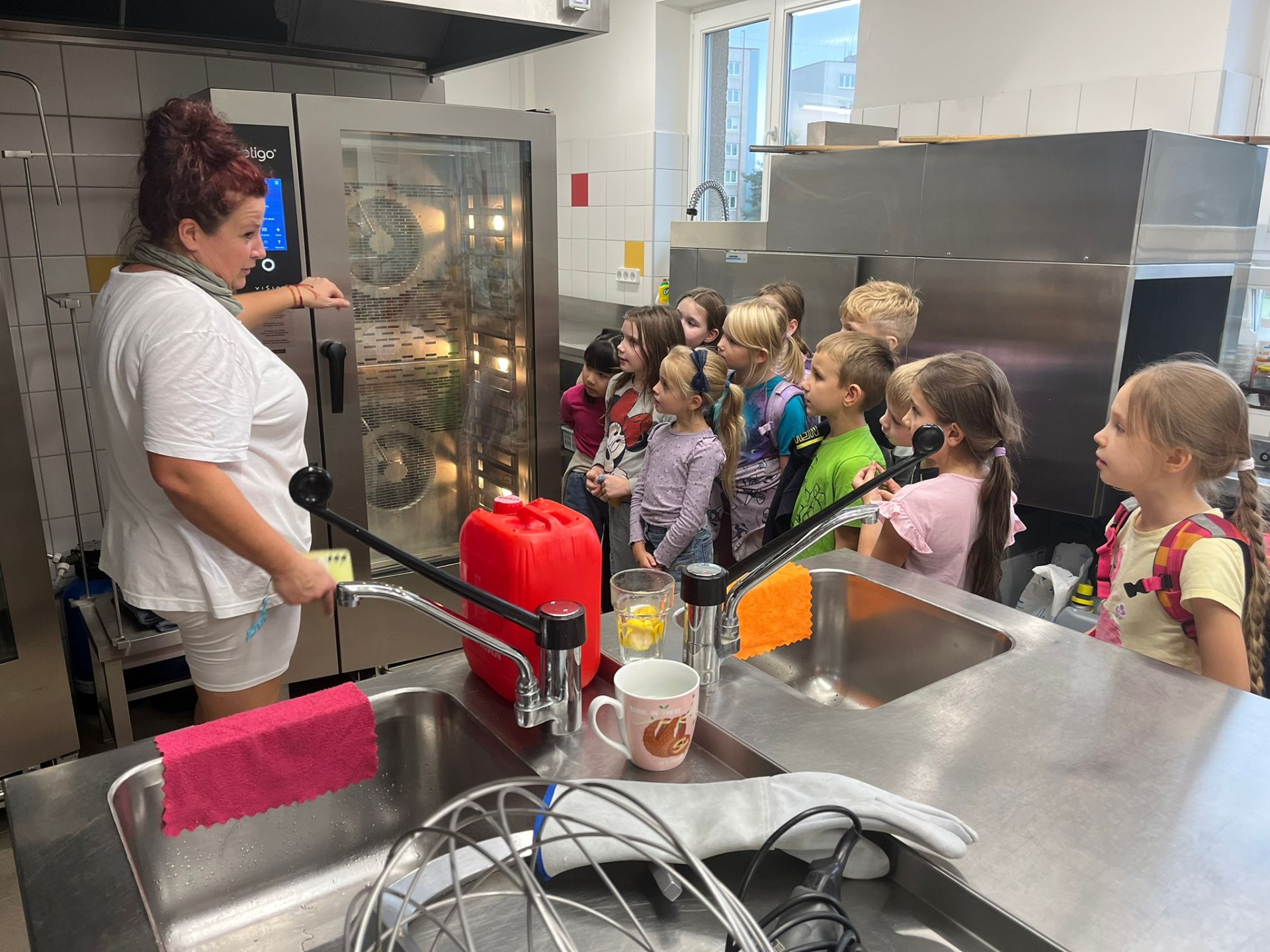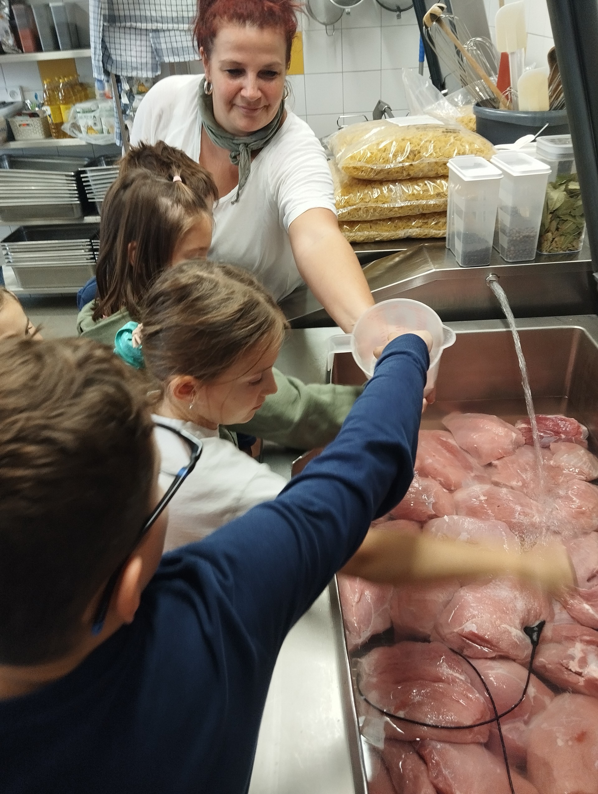 Minulý týden proběhla ukázková hodina školní jídelny a kuchyně za doprovodu paní kuchařky Natálky Kymlové. Děti z druhých tříd navštívily vnitřní prostory kuchyně, kde mohly vidět nejen vybavení, ale i třeba velká balení jídla (např. těstoviny) nad kterými žasly, či přípravu základu pro Hamburskou smetanovou omáčku, z čehož měly veliký zážitek!